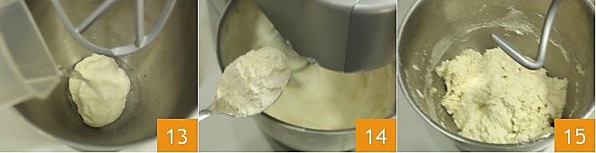 Pour the risen dough into the bowl of a stand mixer fitted with a paddle (if you don't have one, you can knead by hand) and add half of the 18.6 oz of water 13; start the machine at low speed to dissolve the dough, then, once dissolved, gradually add the flour, a tablespoon at a time 14, alternating with the remaining water, in which you have dissolved the salt. When the ingredients have gathered around the paddle, detach it and attach the hook 15, with which you will knead everything for at least 10 minutes at low speed. The dough should cling to the hook and pull away from the sides of the bowl.