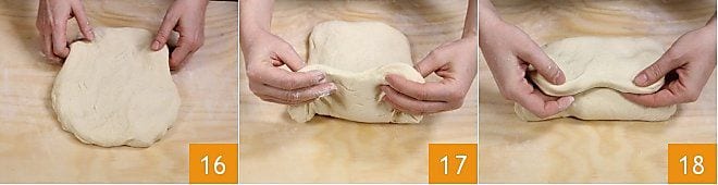 Pour the well-soft dough onto a lightly floured work surface: you need to give it folds to strengthen the dough so that the rise develops upwards. Stretch the dough slightly with your hands 16, giving it a rectangular shape, then fold the first side towards the center and do the same with the other, overlapping it (17-18).