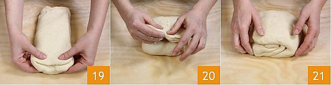 Flip the dough, stretch it a little 19 and repeat the folds as before, folding the sides towards the center (20-21). Let the dough rest for 15-20 minutes. After this time, perform the folds again, as previously illustrated, and let it rest for another 15-20 minutes.