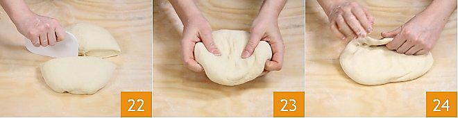At this point, if you want to get two loaves, divide the dough into two equal parts, with which you can form two loaves or two baguettes 22. If you prefer, you can also make a single loaf. Now proceed this way for the loaves: lightly knead a piece, gathering the sides towards the center, flatten it slightly 23, then roll the dough onto itself, starting from one side 24, pressing with your fingers downwards and rolling it to the end. If you want a loaf, fold the two ends of the baguette underneath and round the dough.