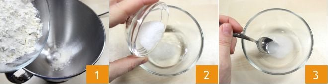 To prepare the bread and salami, start with the bread dough: in the bowl of a stand mixer or a large bowl if kneading by hand, add the sifted manitoba flour and all-purpose flour 1. Pour a small amount of the total water into a small bowl, add the salt 2, and dissolve it by stirring with a teaspoon 3. If you can't find manitoba flour, you can only use all-purpose flour, but be careful to choose one that contains at least 11% protein, you can check this information by reading the product characteristics on the package. Both all-purpose and manitoba flour have a high gluten content, but they differ in their degree of refinement.