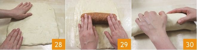 Meanwhile, take the risen bread dough and transfer it to a slightly oiled surface to prevent sticking. Oil your hands if necessary and roll it out, giving it a rectangular shape and a thickness of about 0.75 inches 28. Place the filling in the center of the obtained rectangle 29 and roll the dough over it 30, tucking in the ends on the side of the seal.