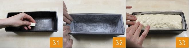 Now butter 31 and line with baking paper a 10x5 inch loaf pan 32 and place the bread and salami with the dough seal facing down so the dough pushes upwards 33.