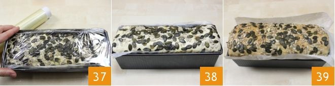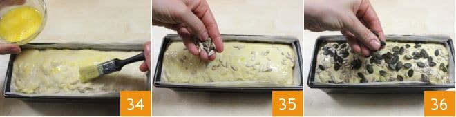 Brush the surface with a beaten egg 34 and sprinkle with sunflower seeds 35 and pumpkin seeds 36 to taste, pressing them to adhere well to the surface. If you like, you can also top your bread and salami with sesame or poppy seeds. Otherwise, leave it plain and add a few drops of milk to the beaten egg for a more golden surface.