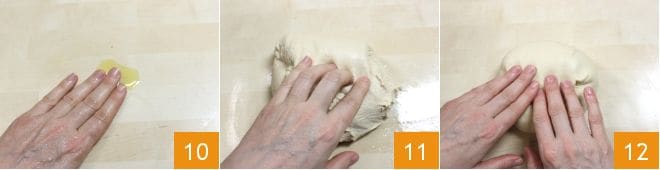 After this time, pour a little oil on a work surface 10, so you can knead without adding flour, then transfer the dough there and start working it with your hands, shaping it into a round shape (11-12).