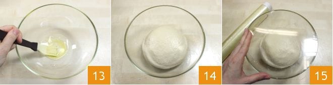 Then oil a bowl using a brush 13 and transfer the dough there 14, cover it with plastic wrap 15 and let it rise for at least two hours at room temperature between 82°F and 86°F, or until it doubles in size.