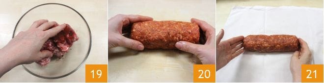 After adding the crushed fennel seeds, mix everything by hand for 5 minutes 19, then oil the work surface again and transfer the mixture there, working it by hand to form a cylindrical sausage about 8 inches long 20. Then get a muslin or a clean kitchen towel and place the sausage on top 21.