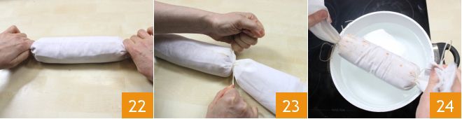Wrap the sausage tightly 22, securing the ends with cooking twine 23 and transfer it to the pot with boiling water, cook for 10 minutes 24. The water should simmer and not boil turbulently, otherwise it will ruin the salami.