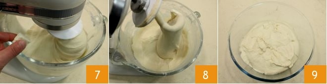 and the amount of warm water indicated for the dough 4. Continue kneading and when the mixture is smooth, stop the mixer and replace the beater with the dough hook 5, add the salt 6