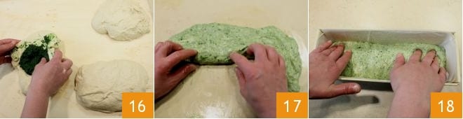 transfer it to a lightly oiled work surface and divide it into three parts (you can wrap the ones not in use at the moment in plastic wrap) and season one with the spinach 16, kneading to incorporate them evenly 17. Then butter and line a 12x4.5 inch loaf pan with parchment paper and place the green dough inside 18.