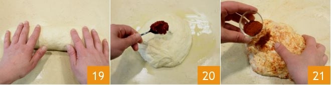 Continue handling the plain dough to shape it into a log the same size as the pan 19 and place it on top of the green dough in the pan. Then season the last part of the dough with the tomato paste 20 and paprika 21.