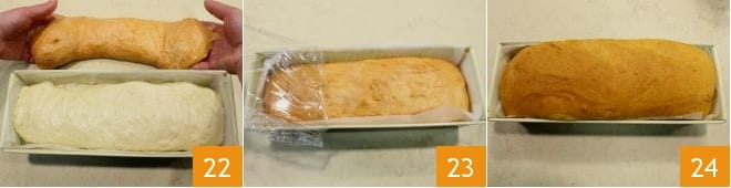 Proceed in the same way and lay the red dough in the pan 22. Cover with plastic wrap 23 and let rise for at least 30 minutes away from drafts. After the necessary time, bake the tricolor bread in a preheated static oven at 392°F for about 60 minutes (356°F for 50 minutes if using a convection oven). Check the cooking with a skewer before finishing baking; when the tricolor bread is cooked, take it out of the oven and let it cool for at least 20 minutes in the pan 24 and then invert it onto a rack to cool completely!