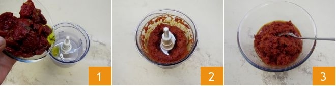 To prepare the sun-dried tomato cream and smoked cheese panzerotti, start with the sun-dried tomato cream; blend the tomatoes together with their oil in a mixer with blades 1 until you get a thick and homogeneous cream 2 which you will transfer into a bowl 3.
