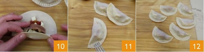 then fold the disks in half 10, pressing well with your fingers to create a half-moon; seal the edges with the tines of a fork 11 and proceed in this way until you have used up all the ingredients 12.