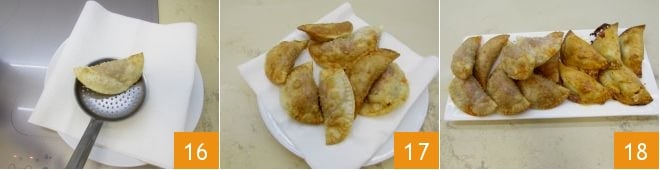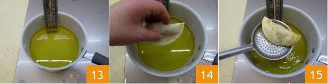 Heat the frying oil in a wide pan 13. When the oil reaches a temperature of 356°F (you can check with a kitchen thermometer), fry 2-3 panzerotti at a time 14 until they become golden and crunchy 15.
