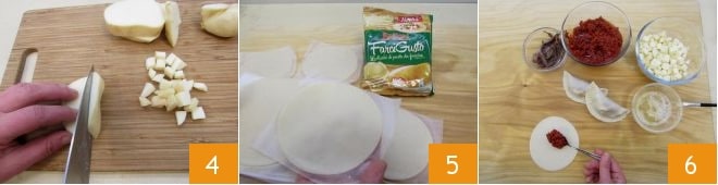 Cut the smoked scamorza cheese into cubes 4, then pat the anchovies dry with paper towels to remove their oil. Once the filling is ready, take one disk of dough at a time 5 and fill it with a teaspoon of the sun-dried tomato cream you prepared 6;