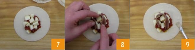 add a few cheese cubes 7 and a fillet of anchovy 8. Brush the edges with some egg white 9,