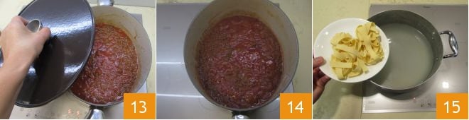 Cover the ragù with a lid 13 and let it cook for about 4 hours on very low heat; it should simmer, and you can stir it very few times just to ensure it doesn't stick to the bottom. Once ready, transfer it to a very large pan. When your ragù is ready 14, cook the pappardelle in plenty of boiling, salted water to taste 15.