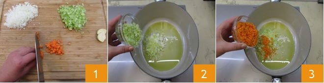 To prepare the pappardelle with hare, start by making the ragù. Wash the celery and carrot. Then peel and trim the carrot, remove the outer strings from the celery, and clean both the onion and the garlic, halving them to remove the core. Finely chop the rest 1. In a casserole, preferably cast iron, pour the oil and add the chopped onion, celery 2, and carrot 3.
