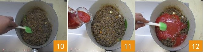 Continue stirring 10 until the alcohol has completely evaporated. Then adjust with salt and pepper, reduce the heat, pour in the tomato purée 11, water, and stir again 12.