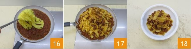 Drain the pasta and pour it directly into the large pan where you transferred the ragù 16, mix everything together 17 and serve your pappardelle with hare still hot 18!