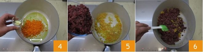 Finally, add the garlic 4. Sauté everything over very low heat, stirring often, for 6-7 minutes. When the soffritto is ready, add the minced hare meat 5 and brown over medium heat, stirring occasionally 6 for about 4-5 minutes.