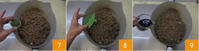 Once the meat has changed color, add the finely chopped rosemary 7 and bay leaves 8. At this point, slightly increase the heat and deglaze with the red wine 9.