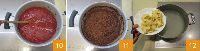 Once it has completely evaporated, add the tomato puree 10 and let everything cook, covered with a lid, for about 4 and a half hours over low heat, stirring occasionally. Once the ragù is ready 11, cook the pasta in plenty of boiling water 12, salted to taste.