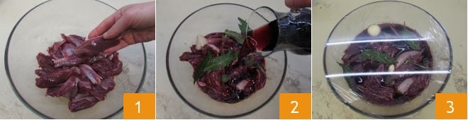 To prepare the pappardelle with venison ragù, start with the marinade. Gently wash the venison pieces under running water and transfer them to a large bowl 1. At this point, add all the spices and aromas for the marinade (fennel, juniper, sage, bay leaf, rosemary, garlic, onion, and cloves), then pour the red wine 2, ensuring all the meat is well covered by the marinade. Cover with plastic wrap 3 and let marinate in the refrigerator for about 20 hours.