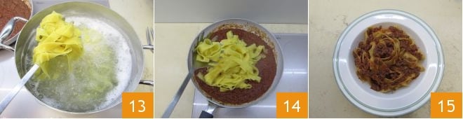 Drain the pappardelle al dente 13 and transfer them to the ragù 14. Sauté everything for a minute and serve your pappardelle with venison ragù still steaming 15!