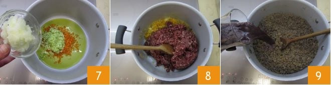 and transfer them to a pot where you have poured the indicated amount of oil 7. Turn on the heat and let the mixture wilt; only then can you add the ground meat 8. Over high heat, brown this as well, stirring often, and when it has completely changed color, deglaze with the red wine 9.