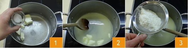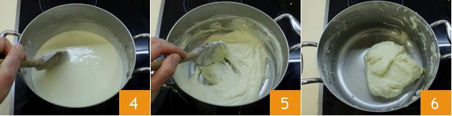 stir vigorously with the wooden spoon to prevent lumps from forming 4. When the mixture has thickened 5, continue cooking it on very low heat until it easily detaches from the sides and forms a white film 6. At this point, you can turn off the heat