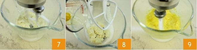 and transfer the dough to the bowl of a stand mixer 7 (or in a bowl to work it with a wooden spoon or an electric mixer). Add one egg at a time 8, waiting for the previous one to be absorbed before adding the next; while adding the eggs, keep the mixer running 9.