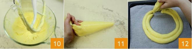 You need to obtain a thick, smooth, and homogeneous dough: once the whisks stop, it should fall in ribbons 10. Pour the mixture into a piping bag without a nozzle and cut the tip to obtain a diameter of about 3/4 inch 11. Line a baking sheet with parchment paper and draw a circle of about 8-9 inches in diameter with a pencil (you can use a cake pan to trace the circumference). With the piping bag, make 3 circles: two concentric 12 and one overlapping the two.