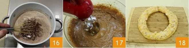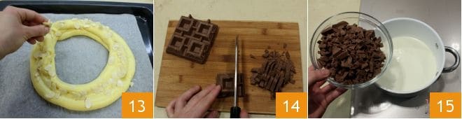 Brush the surface with a beaten egg and sprinkle with sliced almonds 13. Bake the Paris-Brest in a preheated convection oven at 284-302°F for about 1 hour (320°F for about 1 hour and 10 minutes if using a static oven). While the dessert is in the oven, prepare the filling: roughly chop the gianduia chocolate 14; in a saucepan, heat the cream, and when it is about to boil, add the chocolate 15.