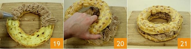 Fill the Paris-Brest with the gianduia cream using a piping bag with a star nozzle 19. Close with the other half of the ring 20, and your Paris-Brest is ready 21!
