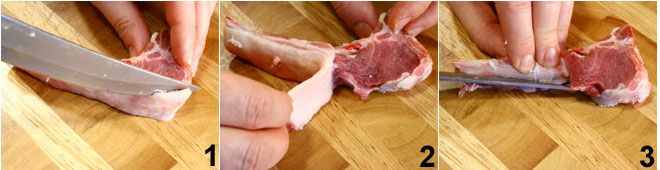 To prepare the parmesan and parsley lamb chops, start by removing the fat around the meat first by cutting it with a knife 1 and then pulling it with your fingers to separate it from the meat 2. Then clean the protruding bone well with a small knife by scraping the entire surface to remove the cartilage that surrounds it 3.
