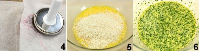 Gently pound the chops with a meat tenderizer after covering them with parchment paper to avoid damaging the meat 4. In a bowl, beat the eggs, adding the grated parmesan 5, a pinch of salt, finely chopped parsley 6, and a crushed garlic clove.