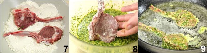 In a large pan, heat 6 tablespoons of oil and the butter; then coat the chops first in flour 7 and then in the egg mixture so that they are completely and perfectly covered 8, drain them well and brown them over high heat on both sides 9, so they become nicely golden without overcooking (2-3 minutes per side). Let the parmesan and parsley lamb chops dry for a moment on some paper towels, then place them on a serving plate accompanied by some lemon wedges, and garnish with curly parsley.