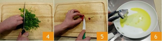 Prepare the other ingredients as well: chop the bunch of parsley 4 and mince the fresh chili pepper, removing the seeds inside 5. Then start toasting the breadcrumbs: in a large pan, heat 3 1/2 tbsps of olive oil over low heat and crush half a clove of garlic 6.