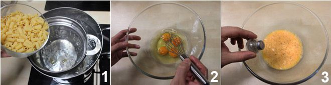 To prepare pasta cacio e ova, cook the tubetti in boiling salted water for the time indicated on the package 1. Meanwhile, in a bowl, beat the eggs with a whisk 2 and season with salt and pepper 3.