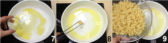 In a non-stick pan, heat the extra virgin olive oil and brown a clove of garlic 7; as soon as it is golden, remove the garlic 8 and turn off the heat. The tubetti will be ready: drain them and toss them for a minute in the oil flavored with garlic 9.