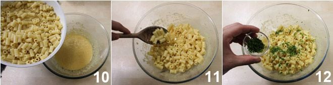 Wait for the tubetti to cool a bit, then add them to the cheese and egg mixture directly in the bowl 10: stir well with a wooden spoon to ensure the pasta is well amalgamated with the eggs 11 and finally finish with a generous sprinkle of chopped parsley 12. Your pasta cacio e ova is ready!