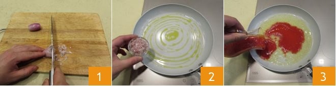 To prepare pasta with green beans, start by preparing the sauce. After peeling the shallot, chop it finely 1 and place it in a pan with the oil 2 and let it flavor for a few minutes over low heat, then add the tomato sauce 3;
