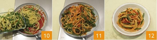 As soon as you have drained the bucatini with the green beans, pour them into the pan with the tomato sauce 10, while you flame it for another minute, mixing to blend the flavors well 11, and finally plate the pasta with green beans and serve while still hot 12.