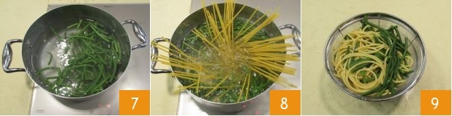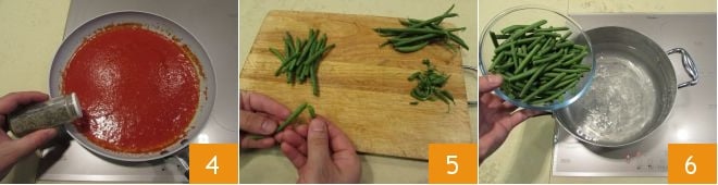 adjust with salt and pepper 4 and cook for about 10-15 minutes. Meanwhile, wash the green beans and remove the two ends and the central string 5, then place them in boiling water 6