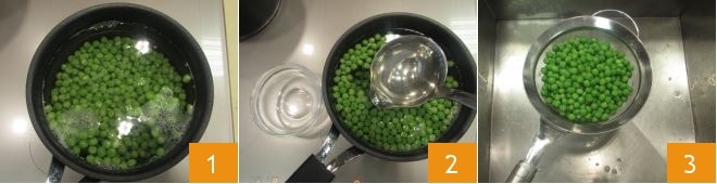 To prepare the pasta mummies, start by boiling the peas for about 4 minutes 1. Place a pot full of water on the stove, and bring it to a boil, it will be used for cooking the pasta. Before the peas are fully cooked, take a small ladle of the pea cooking water (about 1.4 oz) and set it aside in a small bowl 2. After the peas are cooked, drain them 3