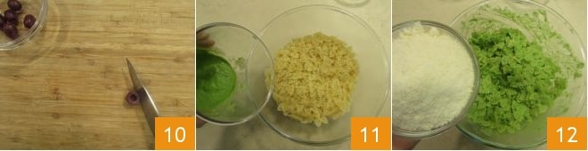 Cut the olives in half to make the little eyes 10. Drain the mini bow-tie pasta, put them in a bowl, and dress with the pea pesto 11, flavor with the grated Parmigiano cheese 12.