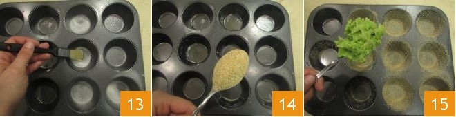 Brush a muffin tin with oil 13, line the bottoms and sides of 8 molds with breadcrumbs 14, and fill them with about 1 and 1/2 tablespoons of pasta 15.