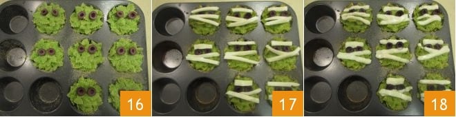 Place the olive slices on top of the pasta baskets to simulate the little eyes 16. Bake in a preheated oven at 390°F, for 10 minutes. After 10 minutes, add the cheese strips not perfectly aligned to create the bandages 17 and bake again for just 2 minutes, the time for the cheese to melt. Once cooked, take your pasta mummies out of the oven and serve them hot 18.